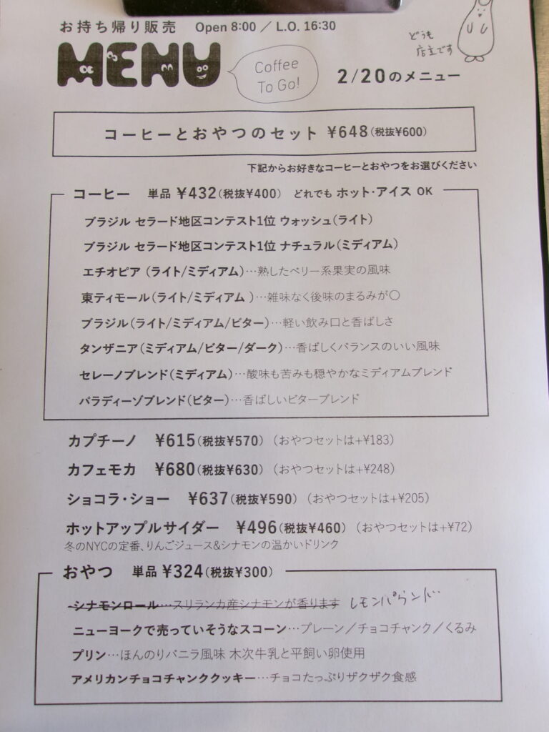 毎週金曜日の8時から16時半までテイクアウトでホットコーヒーやアイスコーヒー、おやつ、コーヒー豆を店頭販売しております