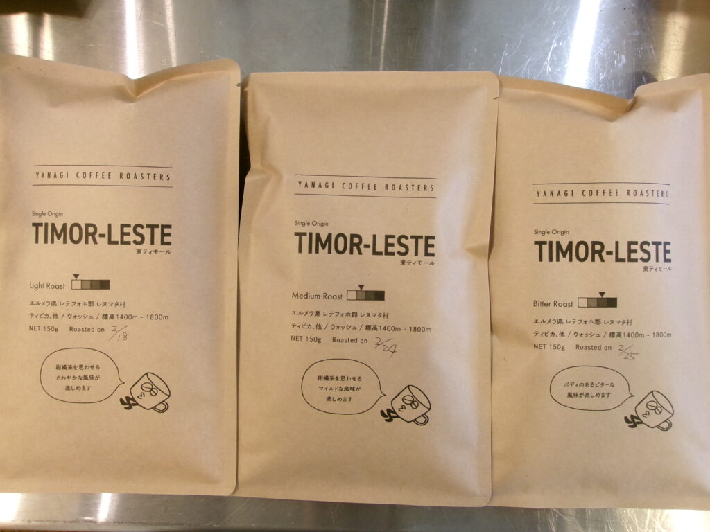 焙煎済みのコーヒー豆は東ティモールの焙煎違い3種類と、画像の3種類となります
