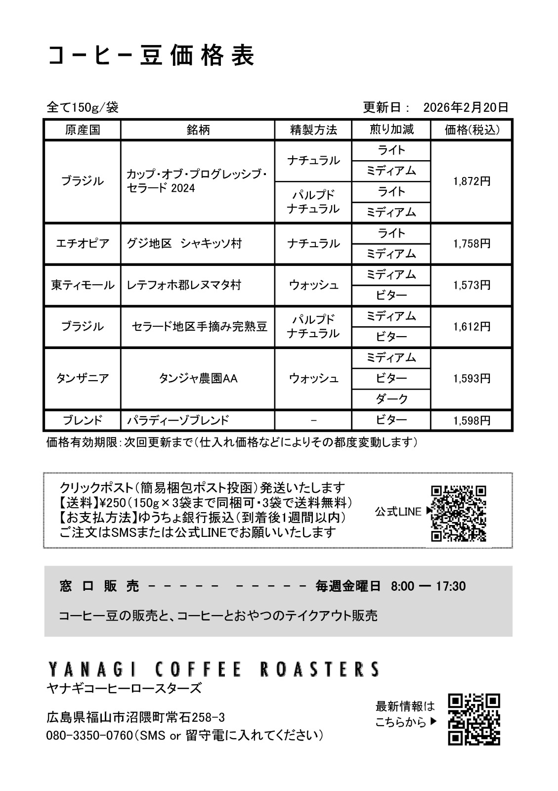 ご注文方法② オンラインショップ(お支払い方法:クレジットカードなど各種) https://yanagicoffeeroasters.stores.jp