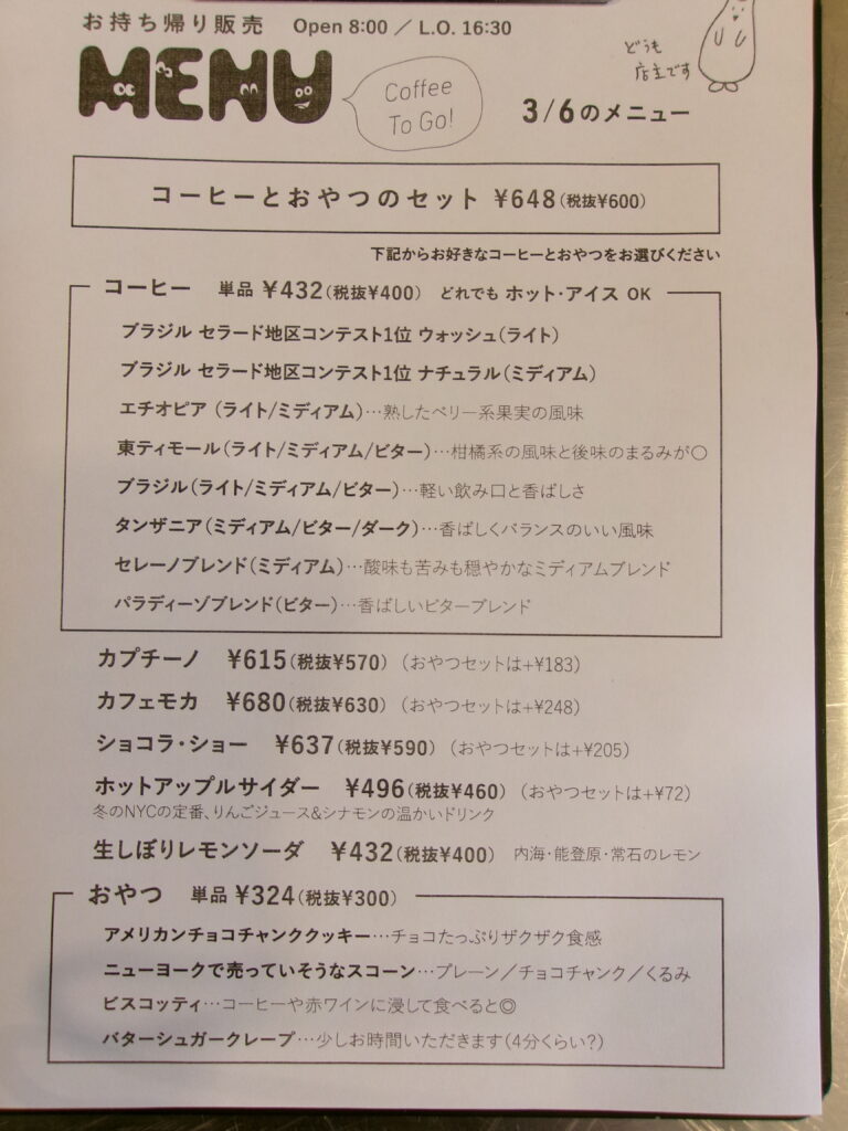 コーヒー ¥432- 色々な国と焙煎具合からお選びいただけます