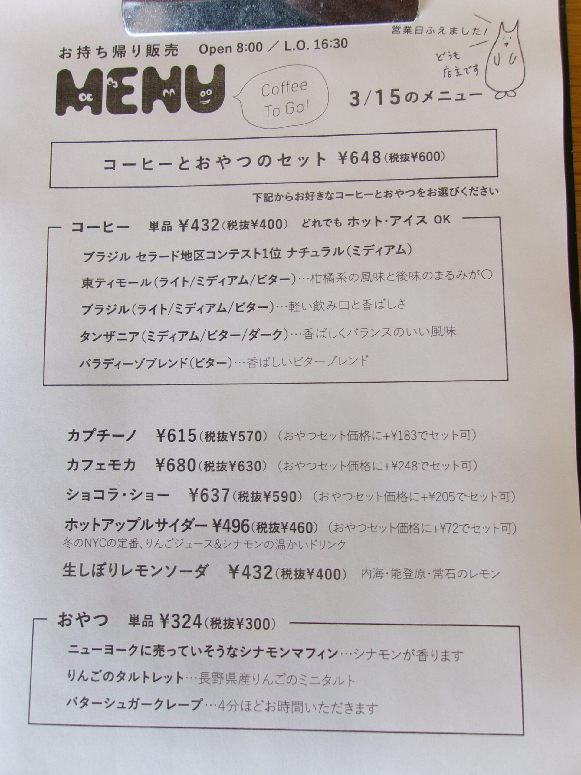 営業の問合せ、コーヒー豆、おやつの取り置き